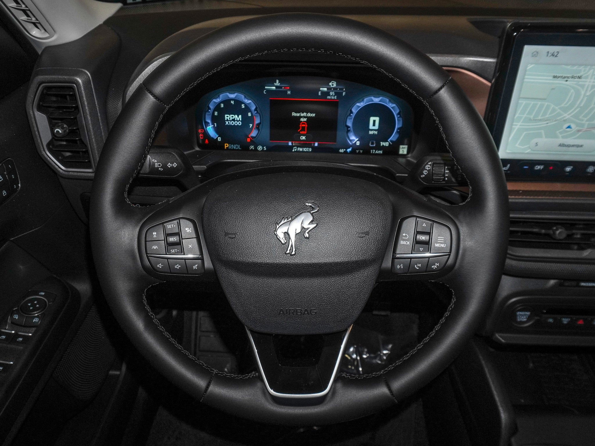 The Outer Banks trim leans into comfort without losing the Bronco edge. Inside you get heated power front seats, a heated leather wrapped steering wheel, dual zone automatic climate control, and a sharp digital instrument cluster. The massive 13.2 inch touchscreen with SYNC 4 keeps maps, music, and apps front and center, while the Outer Banks Tech Package adds premium audio and extra tech touches. A power moonroof lets New Mexico sunshine flood the cabin on those perfect blue sky days.