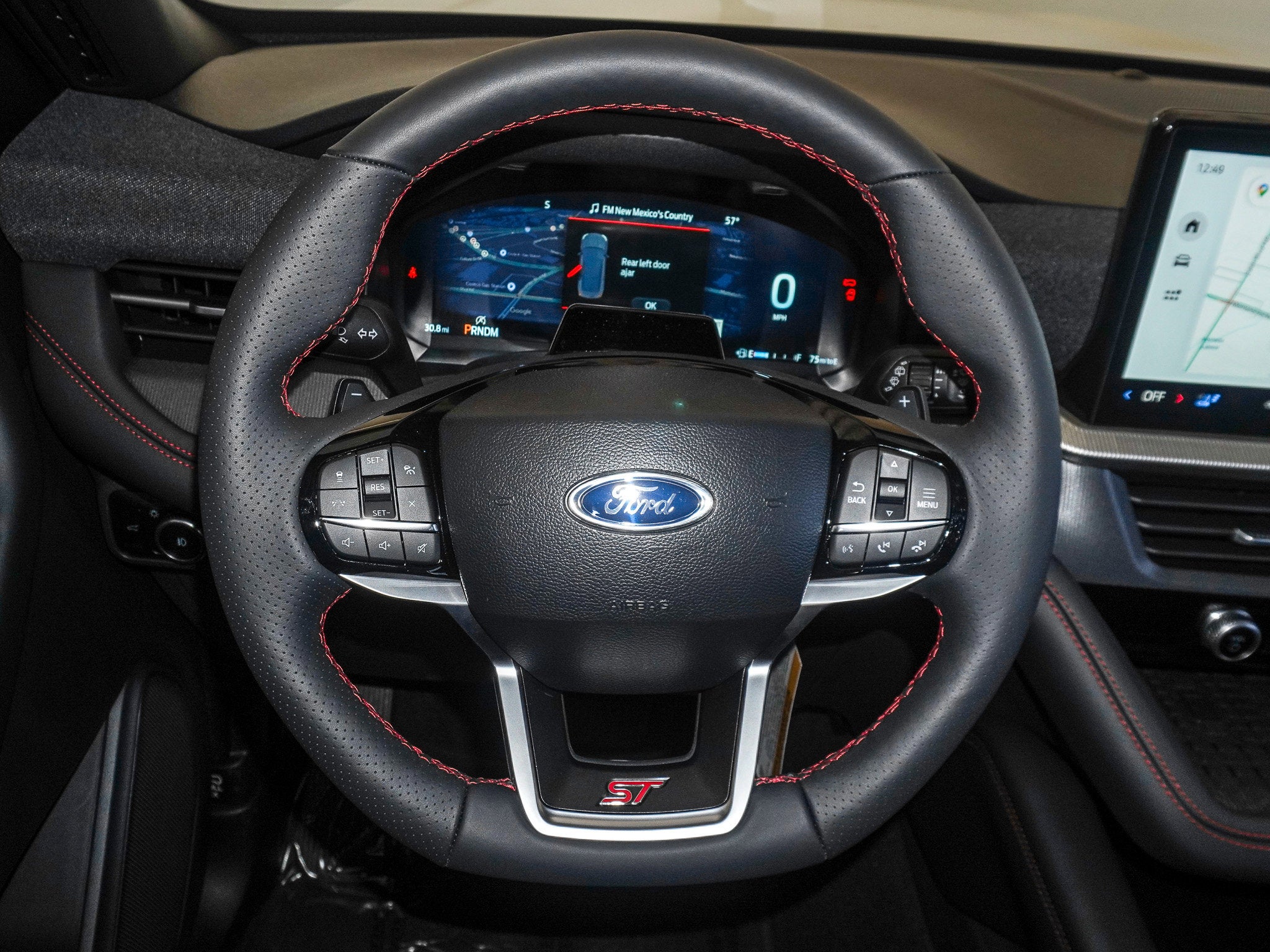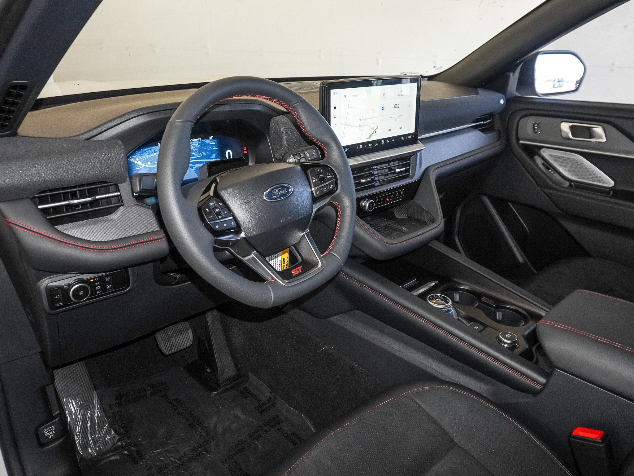 Inside, the ST cabin brings serious attitude with Onyx Miko seats, heated and ventilated front seats, heated second row seats, ambient lighting, and a 12.3 inch digital instrument cluster. The massive 13.2 inch touchscreen with SYNC 4 keeps tech front and center, while the Sun and Sound Package adds a panoramic Vista Roof and a booming B and O sound system. BlueCruise hands free driving capability makes long highway stretches feel effortless.
