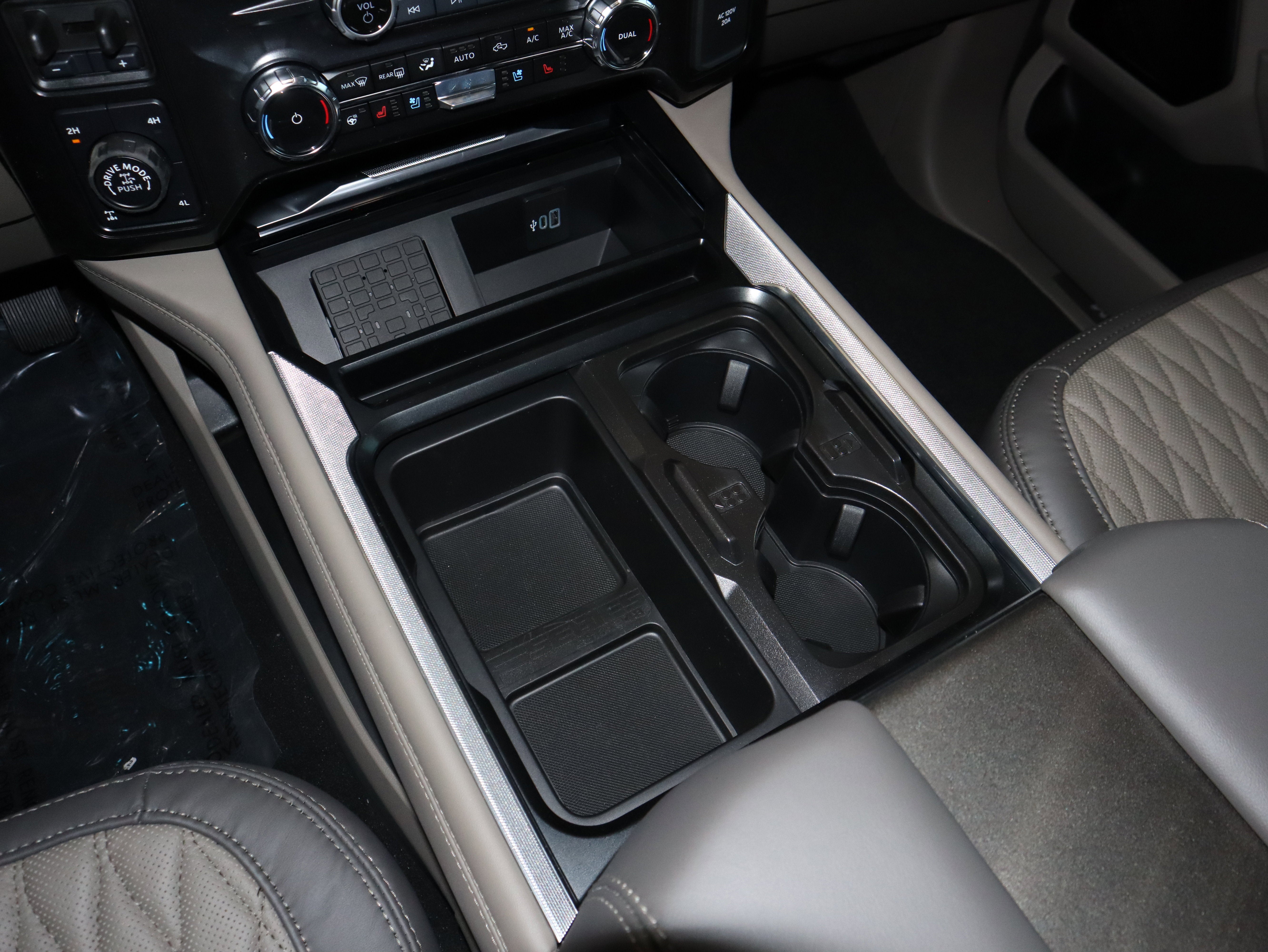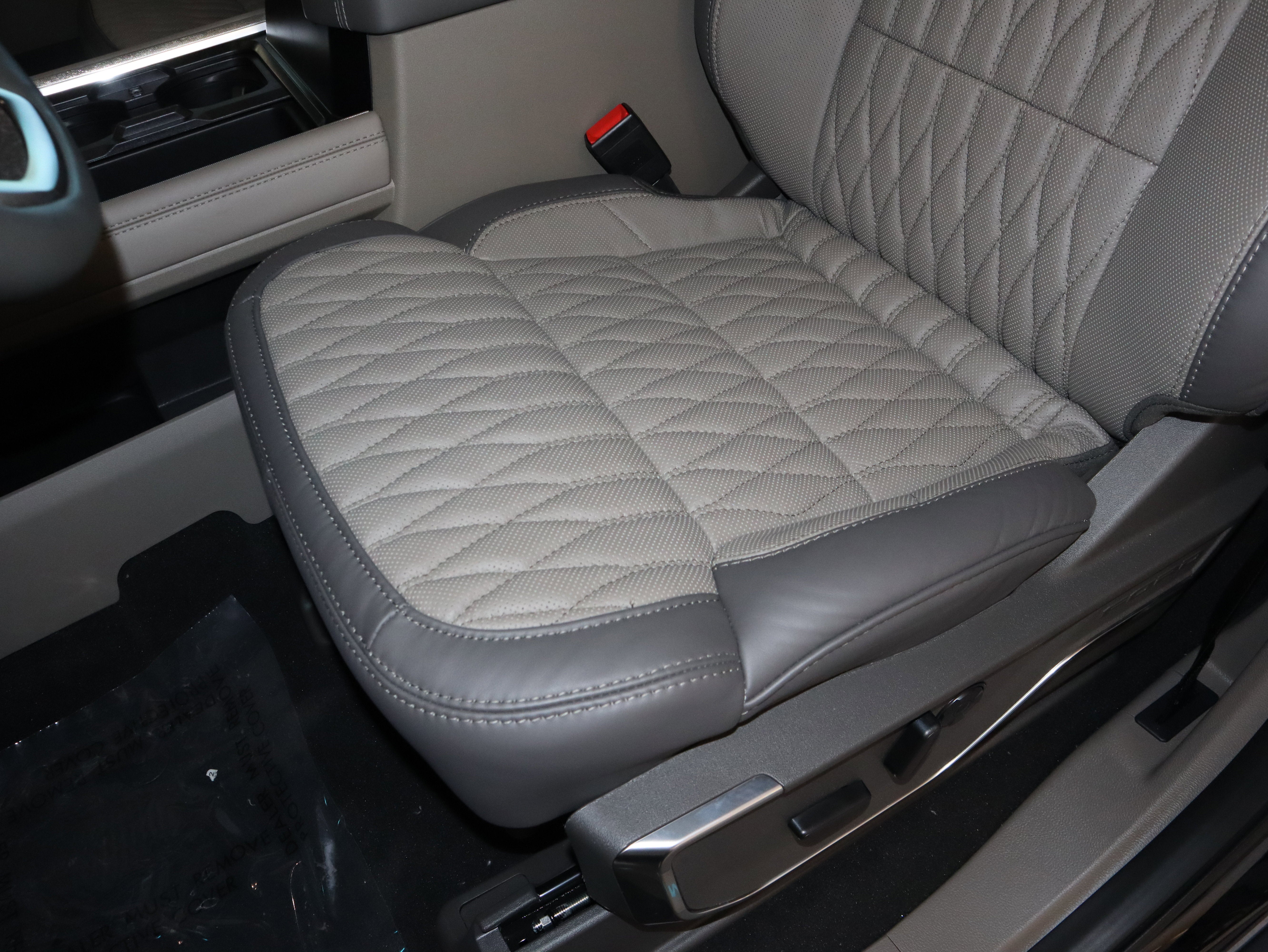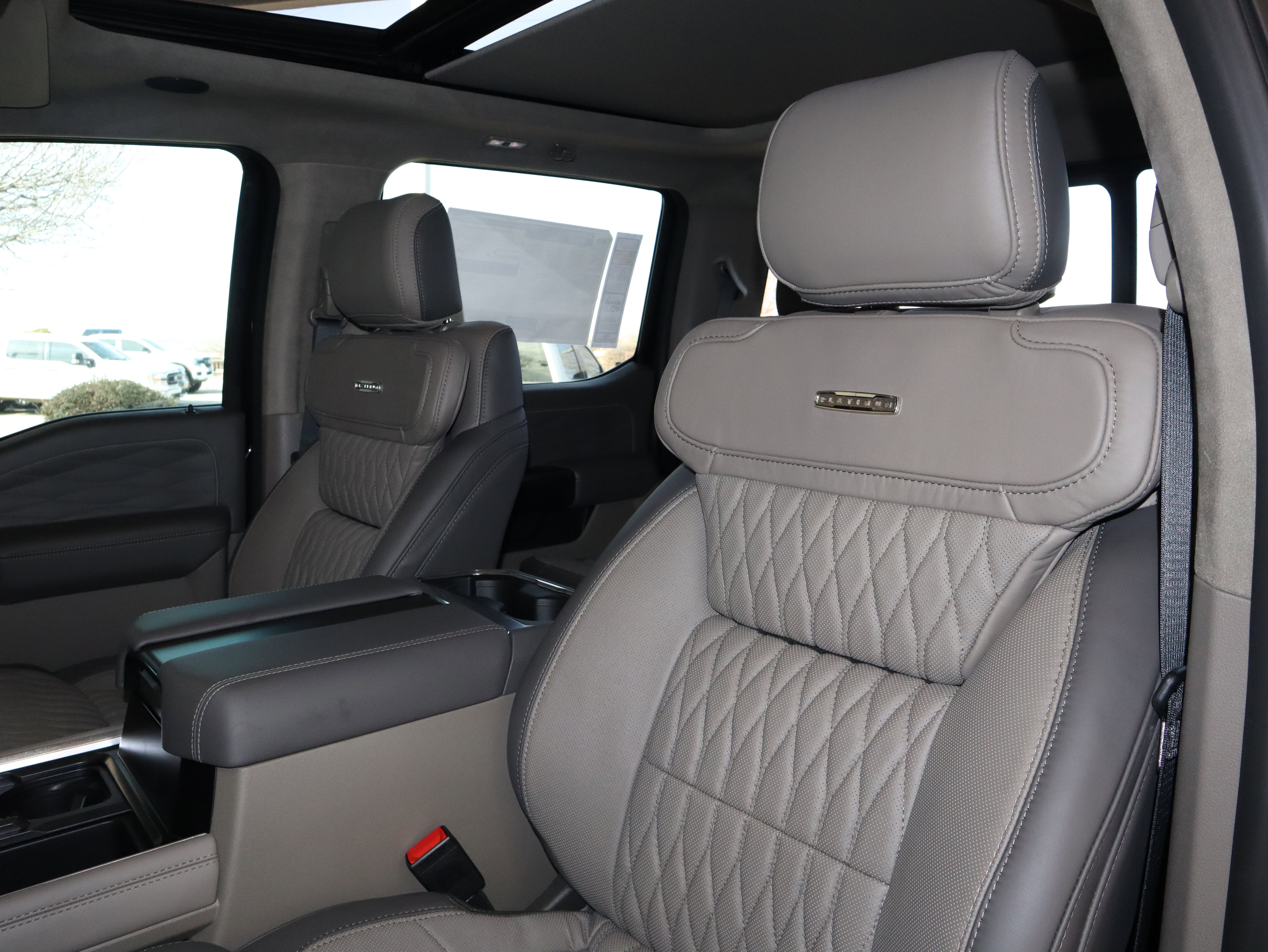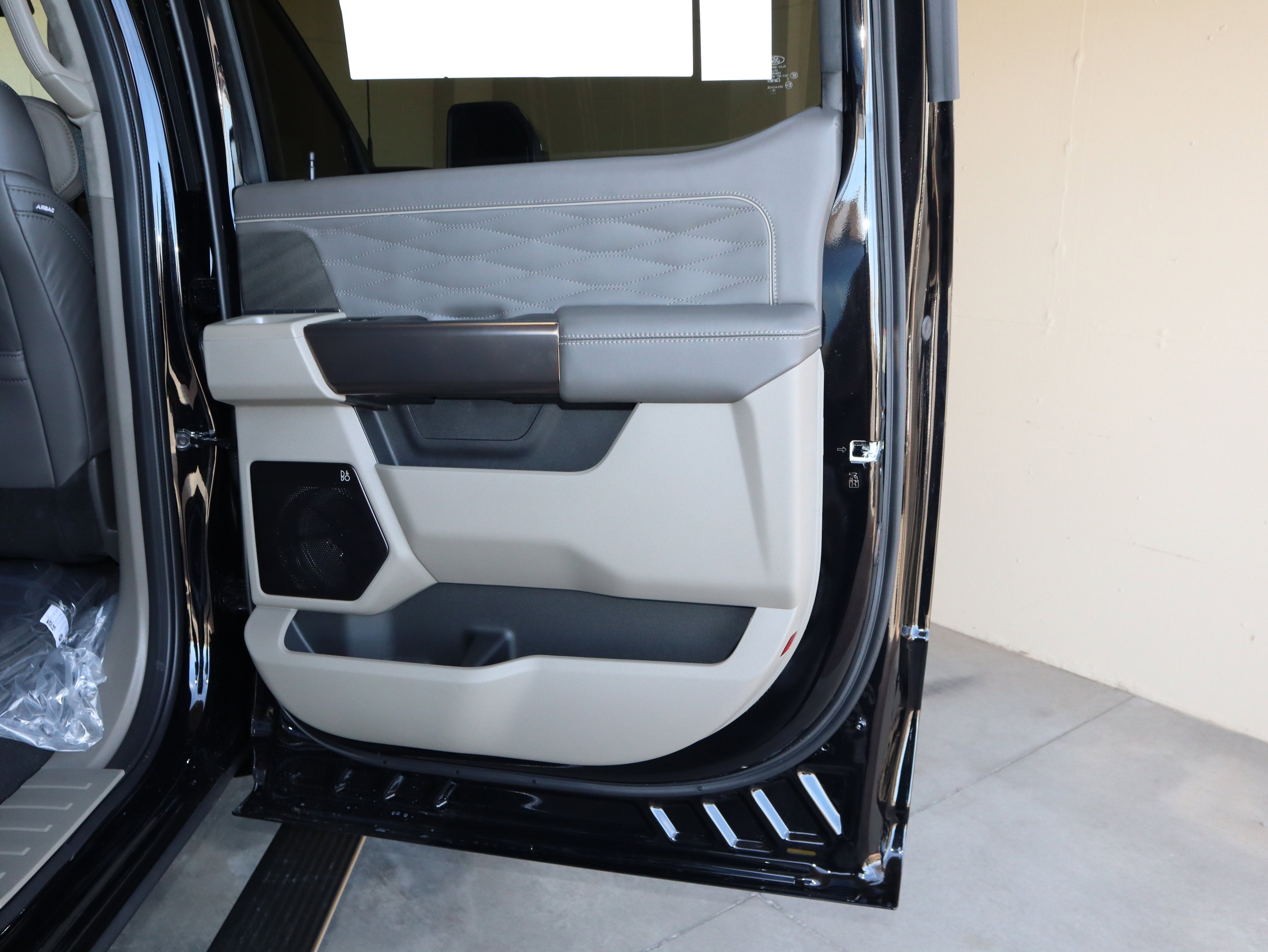 Inside, the Smoked Truffle leather interior feels more like a high end lounge than a job site rig. You get massaging front seats, head up display, adaptive cruise control, a 360 degree camera, SYNC 4 with a 12 inch screen, and a B and O Unleashed sound system. A twin panel moonroof and power running boards add comfort to every mile.