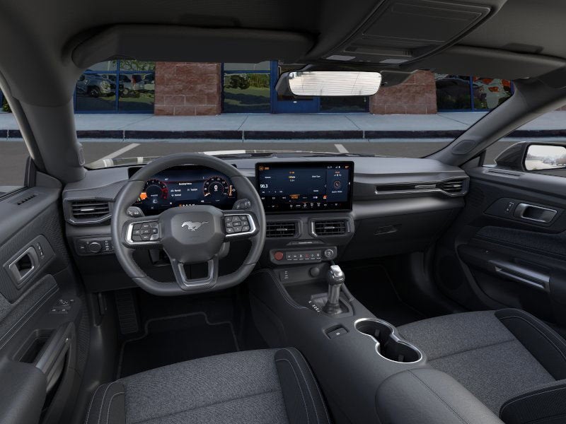 The 18 inch Shadow Silver cast aluminum wheels give it a clean, athletic stance, and the spoiler delete keeps the look sleek and uncluttered, like a true drivers car. Inside, the Black Onyx cloth seats set the tone while a dual screen cockpit featuring a 12.4 inch digital cluster and 13.2 inch SYNC 4 touchscreen wraps you in modern tech.